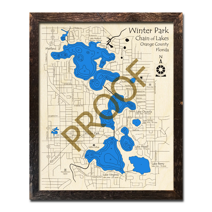 Winter Park Chain of Lakes, FL Wood Map | 3D Topographic Wood Chart